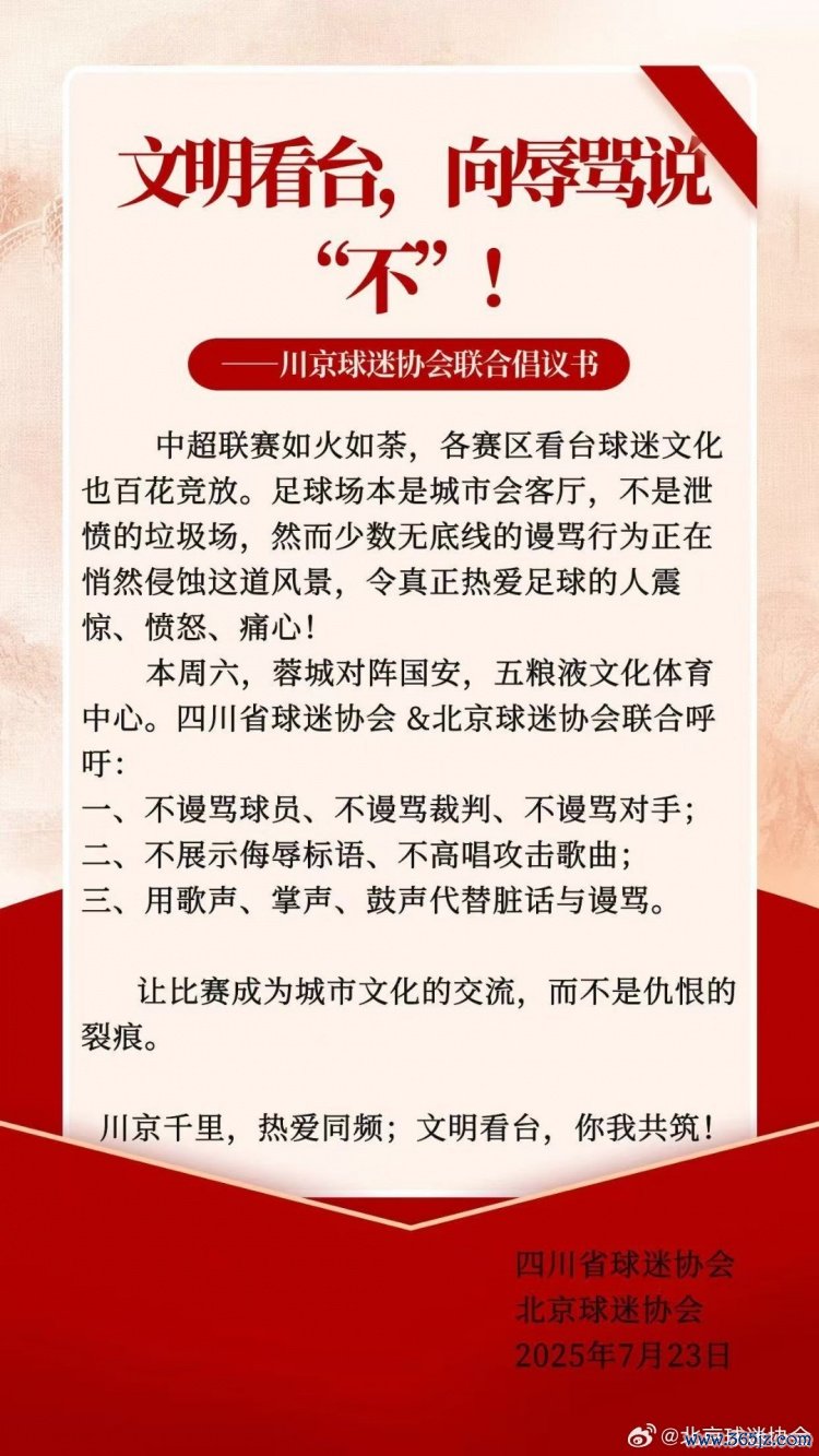 7月26日讯 今晚,中超联赛第18轮,成皆蓉城将在主场对阵北京国安。赛前,川京球迷协会衔接倡议书:好意思丽看台,向吊祭说“不”!