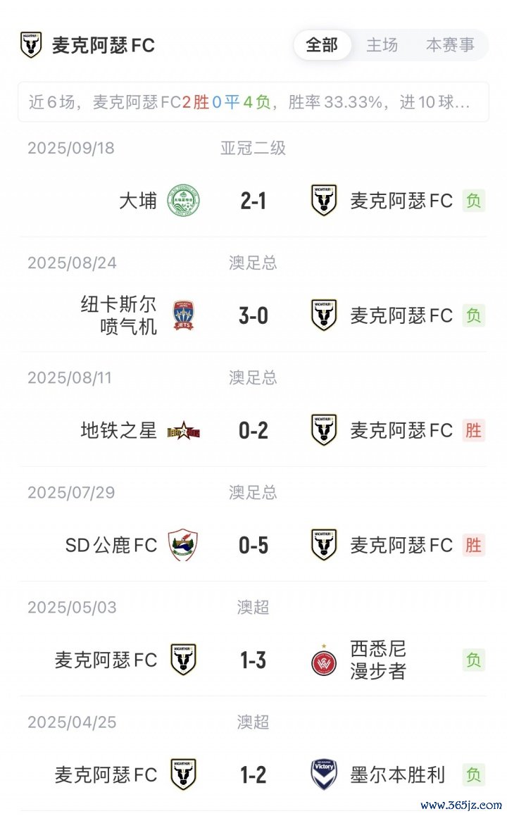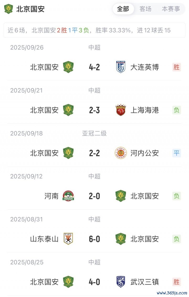 国安与麦克阿瑟此前还未交手过,两边近6场比赛战绩如下:
