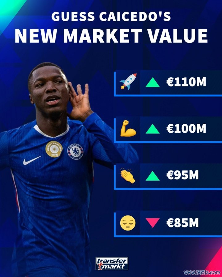 凯塞多现在身价为9000万欧,这次更新最高将涨至1.1亿欧,成为英超第10位亿元先生,最低将下落至8500万欧。