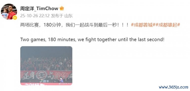 赛后,蓉城球员周定洋在个东说念主微博中写说念:两场比赛,180分钟,咱们沿路战役到终末一秒!!!