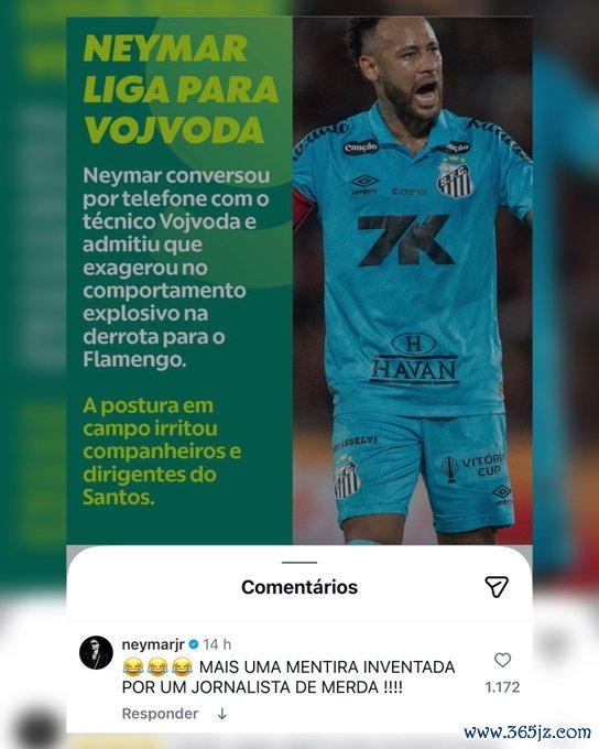 本轮巴甲联赛戒指后,有媒体报谈称内马尔曾主动干系主帅沃伊沃达,并承认在输给弗拉门戈的比赛中我方的过激行径如实过分。对此,内马尔在ge新闻网Instagram推文褒贬区平直酬劳:“这又是某个垃圾记者假造的谣喙。”