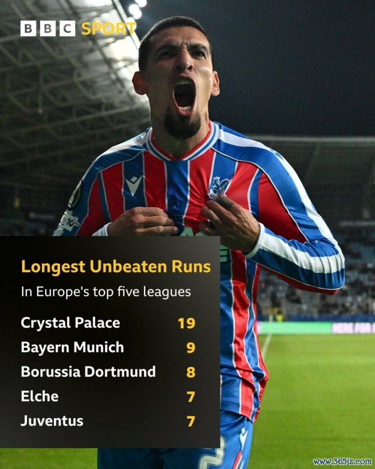 10月3日讯 BBC统计了当今五大联赛球队的不败场次,比肩出榜单,水晶宫19场居首,拜仁9场次席。