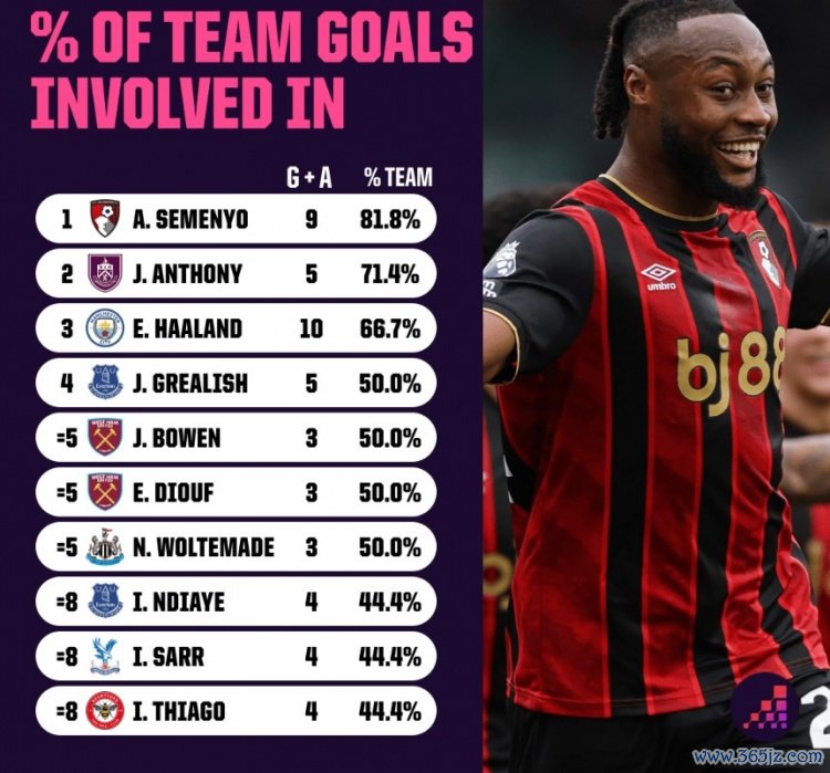 10月8日讯 本赛季,伯恩茅斯边锋塞梅尼奥不息了出色的情景,他在球队贫困中的要紧性不问可知。字据OPTA的数据统计,塞梅尼奥参与进球数占球队总进球数的81.8%,为英超球员最高。
