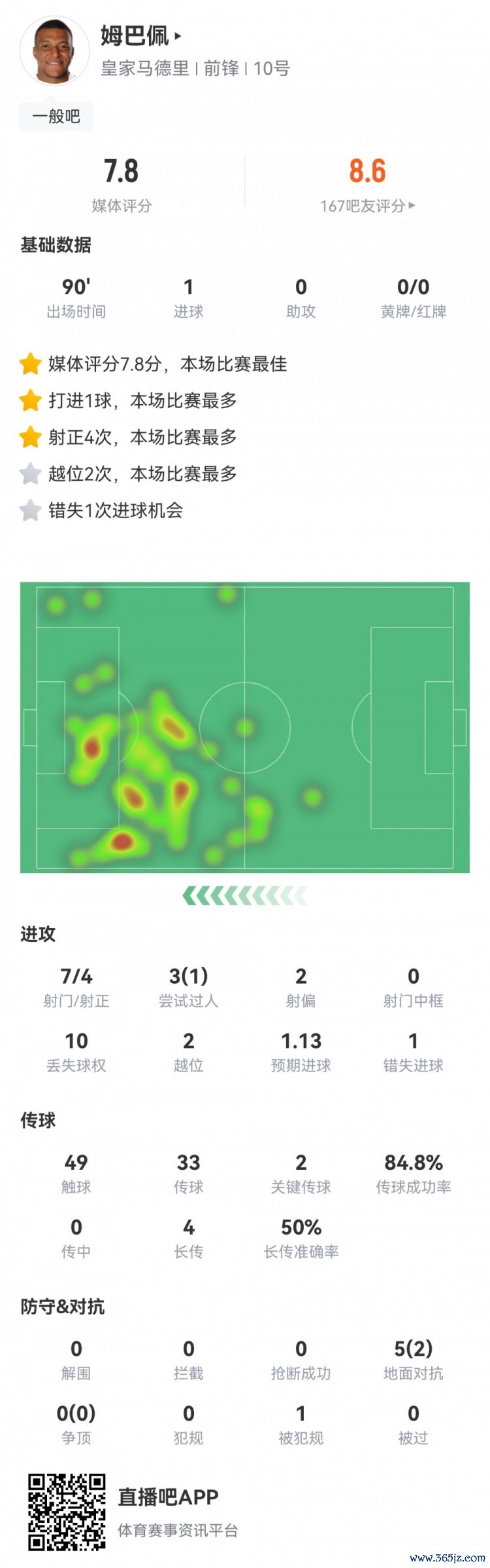 10月20日讯 本轮西甲,皇马1-0赫塔费。此役姆巴佩首发打满全场,球员全场要点数据如下↓