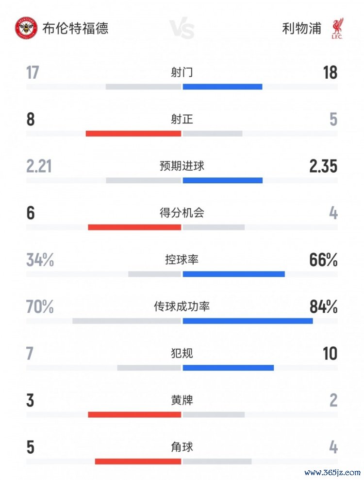 10月26日讯 本轮英超,利物浦2-3不敌布伦特福德遇到四连败!两边全场要点数据对比如下↓(主队布伦特福德在前)