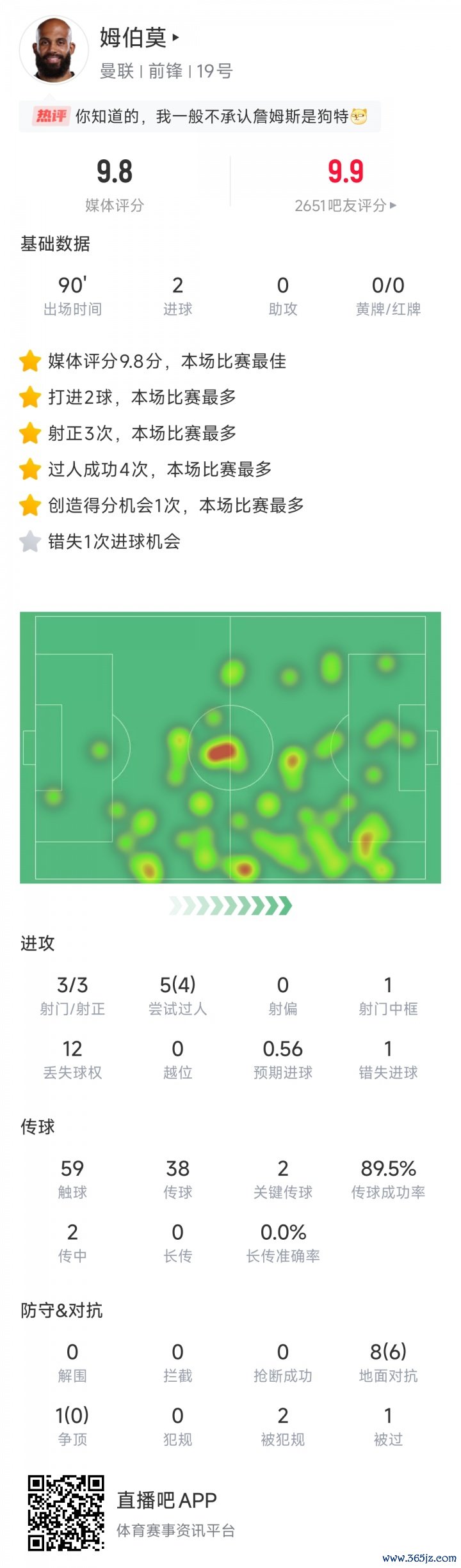 本场比赛姆伯莫首发出战打满90分钟,孝敬2球,他近3场3球1助情状火热,是曼联的火力担当。