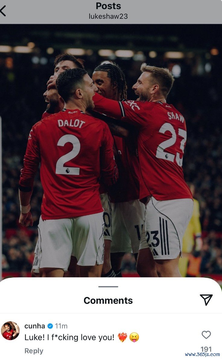 本场比赛库尼亚破门,卢克-肖也助攻卡塞米罗进球。赛后卢克-肖在个东说念主社媒晒出团队庆祝合照,库尼亚驳斥说念:“卢克!我太TM爱你了!”