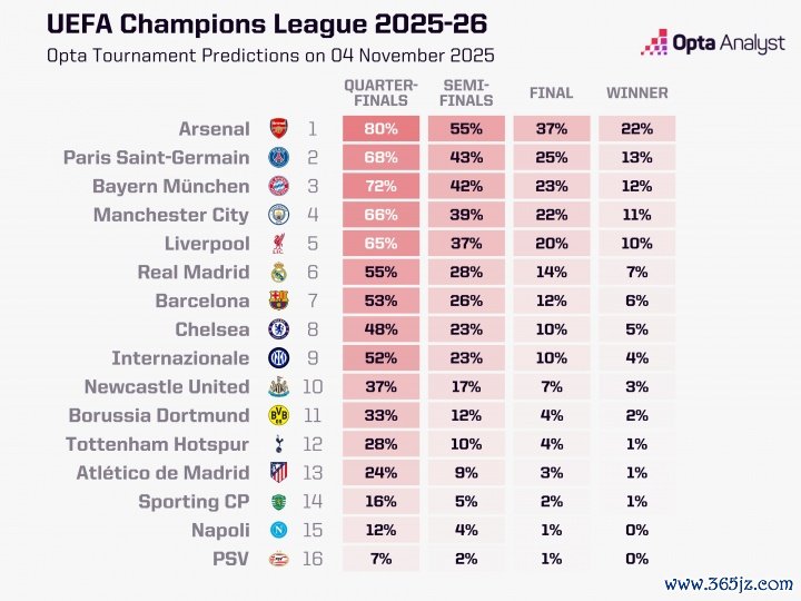 11月05日讯 当天欧冠,拜仁客胜巴黎,利物浦打败皇马,阿森纳、马竞、热刺奏效,那不勒斯、尤文战平。OPTA更新欧冠夺冠概率。