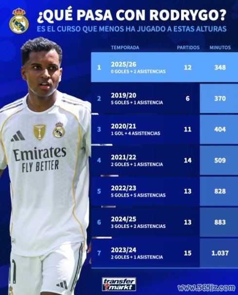 德国转会市集盘货了罗德里戈加盟皇马后7个赛季同时出场数据,本赛季他尽管出战了12场比赛,但出场技能仅为348分钟。在这个流程中,他送出了两次助攻。