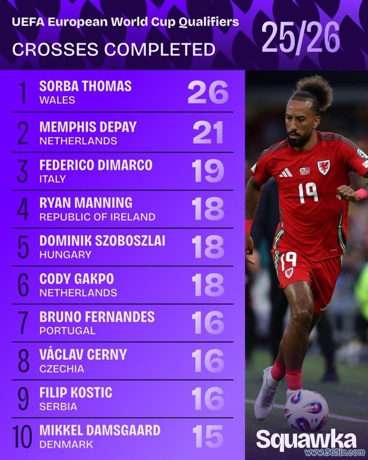 11月20日讯 本届世欧预小组赛也曾告一段落,squakwa也统计了本届赛事胜利传中情况,威尔士边锋索尔巴·托马斯领跑。