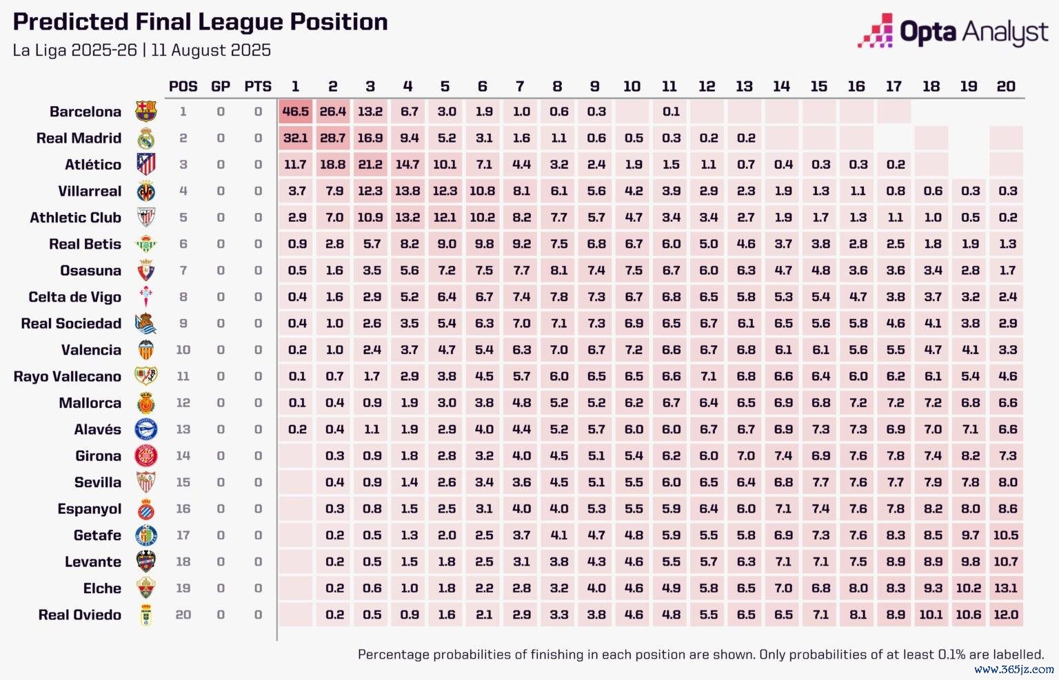 2025/26赛季西甲将于周末打响,著名数据机构Opta在开赛前瞻望了各队的夺冠概率,巴萨是头号热点,皇马位列次席,马竞排在榜单第三位。