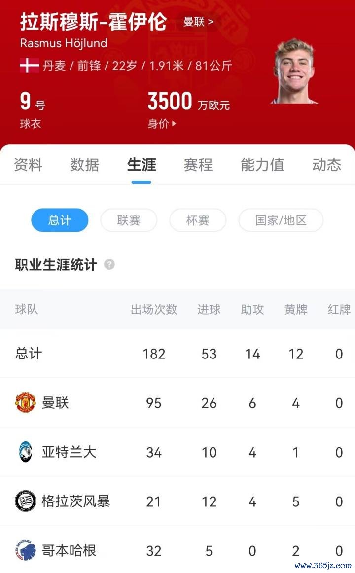 霍伊伦现年22岁,丹麦时尚。曼联在2023年夏天以升迁7500万欧元转会费签下霍伊伦,上赛季球员各赛事出场52次,孝顺10球3助,当今霍伊伦德回身价为3500万欧元。