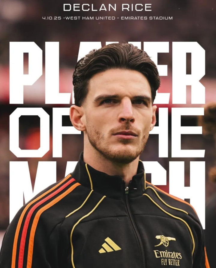 官方:赖斯被阿森纳官方票选为了全场比赛最好球员。