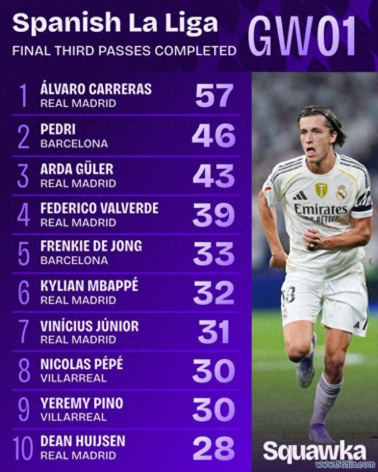 直播吧8月21日讯 西甲首轮战罢,Squawka统计球员在迫切三区完成传球次数,A费57次居首,佩德里、居勒尔分列二三位。