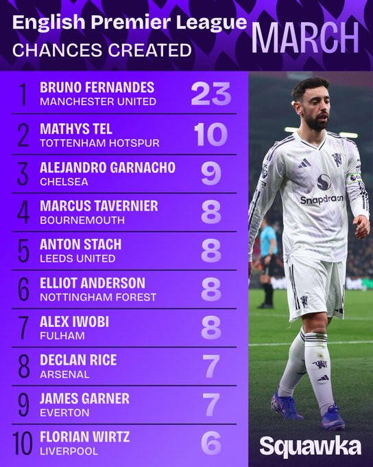 虎扑03月27日讯曼联官方宣布,B费当选三月份队内最佳球员。Squawka数据统计 ,B费三月份英超共创造23次机会,在职业联赛 中断层领跑 。