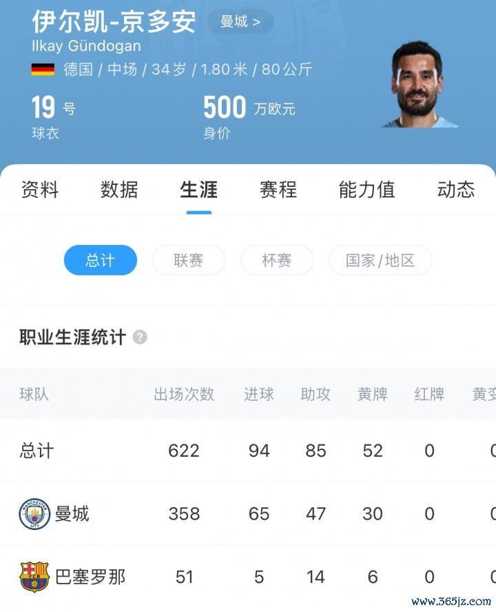 34岁的京多安与曼城还有一年公约,球员上赛季50场3球6助攻,德回身价500万欧。