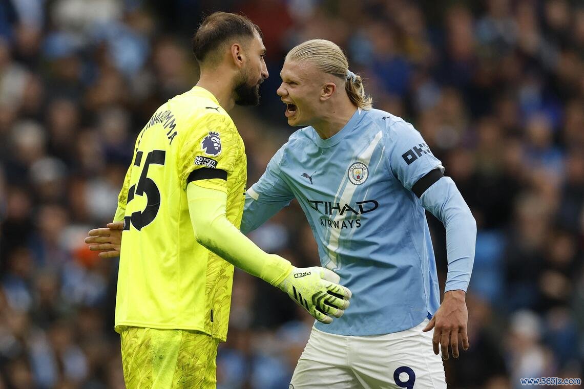 曼城前卫哈兰德(右)在本年1月和球队签下为期九年半的长约。这个赛季他情状火热,此役也获选为全场最好,但他在赛后说,屡献神扑的新门将唐纳鲁马(左)更值得拿到全场最好的荣誉。