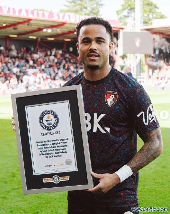 伯恩茅斯官方音信,尤斯廷-克鲁伊维特收到了吉尼斯寰宇记载文凭。
