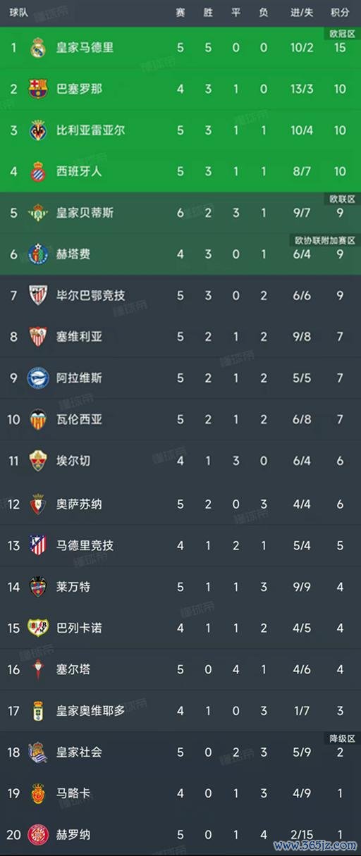北京时辰9月21日,西甲第5轮逼迫了6场比赛,最新积分榜如下!