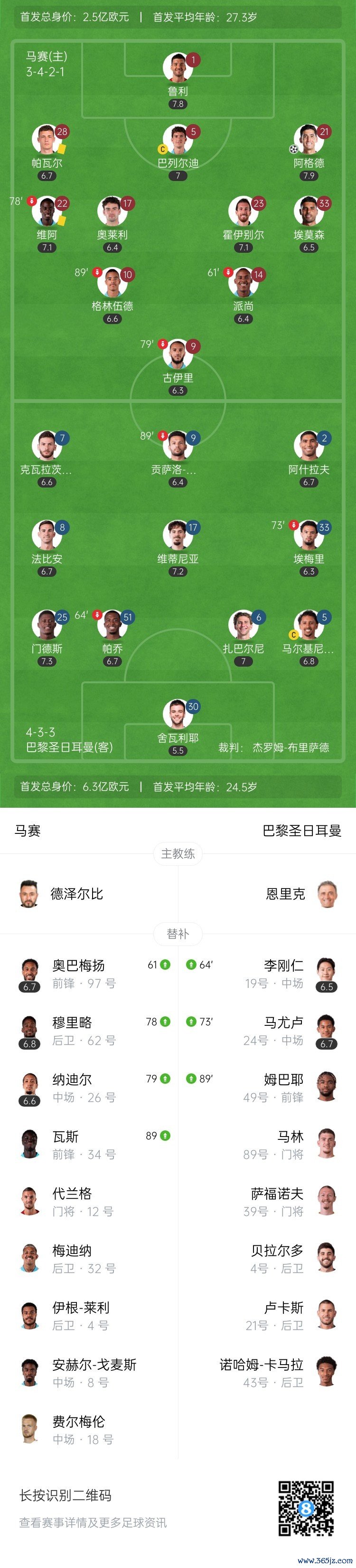 下半场补时5分钟。最终全场比赛截止,马赛1-0巴黎。