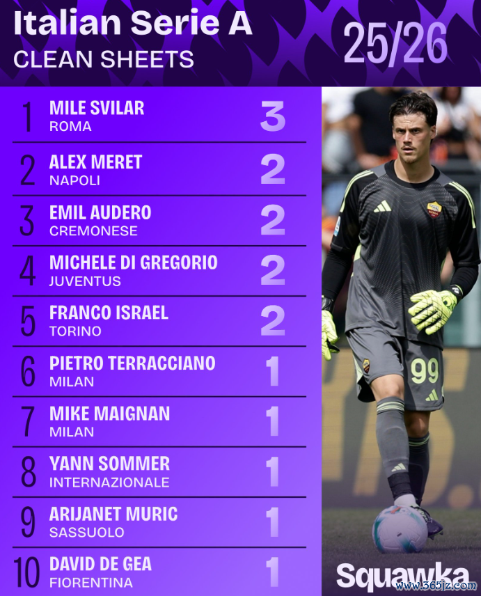 值得一提的是,斯维拉尔2025年24场意甲联赛保握14场零封,这项数据亦然意甲第一。