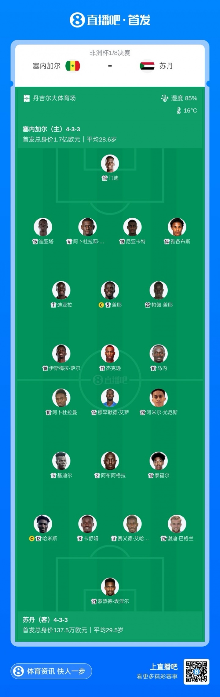01月03日讯 非洲杯1/8决赛,塞内加尔对阵苏丹,赛前首发公布。