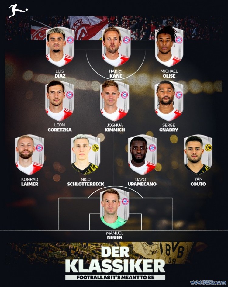 10月18日讯 本轮德甲将献艺焦点对决拜仁对阵多特,德甲官方也通过球迷票选评比出两边最好11东谈主声势,其中凯恩领衔拜仁9东谈主在列,具体如下: