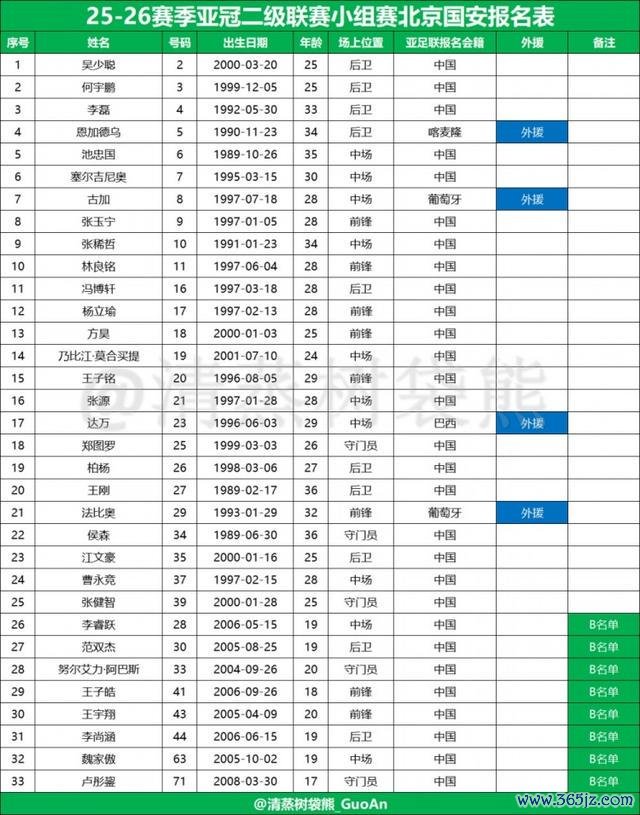 直播吧8月19日讯 当天,博主“清蒸树袋熊_GuoAn”在社媒晒出了国安干与亚冠二级联赛的球员报名表,其中恩加德乌、法比奥、古加和达万四名外助在列,斯帕吉奇无缘;国内球员方面,塞尔吉尼奥、张玉宁、张稀哲、林良铭等领衔。